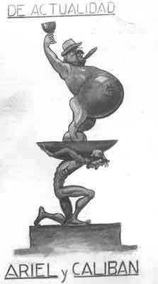 caricatura que dice mucho. En la vidriera del restaurant Naturista en la calle Ahumada, hay una caricatura del monumento a Rodó, que como se sabe, representa a Caliban (la fuerza bruta) sosteniendo a Ariel (los valores intelectuales. En la caricatura se han cambiado los papeles y aparece Ariel delgado y fino sosteniendo a Caliban, enorme y tosco. Esa caricatura tiene mas valor de lo que parece, pués es un fiel retrato de la situación de la Republica en que la masa electoral compuesta por los mas y por consiguiente los menos preparados (Caliban), ha asumido el Gobierno y se empeña en aplastar a Ariel. El aumento de sueldos sin control, que tras la continua elevación de los costos de la vida y que a su vez hace ilusorias las mejoría de las remuneraciones, es la obra de Caliban, que no está preparado para gobernar, pués su función no ha podido ser esa. Caliban nació para soportar a Ariel y el día que este último sucumba bajo el peso abrumador, inmediatamente después seguirá la muerte del primero, que no es capaz de vivir sin la dirección de Ariel. Ariel no quiere defenderse por que estima que la democracia exige el dominio de Caliban, por que forma el mayor número, sin embargo es tal la superioridad de las fuerzas intelectuales sobre las materias que estas últimas no sabrían oponerse si se hiciera algo razonable para colocar las cosas en su lugar. Las Industrias de Chile (Ariel) , acaban de celebrar en Santiago una gran convención en que se pusieron de manifiesto sus quejas por la pereza y falta de disciplina de que hacen gala los trabajadores (Caliban) , pero no se han atrevido a plantear el problema en su verdadero lugar, que no sería otro que no volver a colocar el Gobierno de los negocios en la cabeza, quitandoselo a los piés. Este es el problema de Chile. Una casa se llueve por que se ha colocado el techo a raíz del suelo y los cimientos en lo alto, no tiene mas remedio para que no se llueva otra vez, que volver a colocar en lo alto lo que no ha debido jamás ser colocado abajo. Mientras el voto de un Magistrado tenga igual valor que el del gañan, el del General como el del que limpia las mulas, ocurrirá el fenomeno de que se juntarán 100 gañanes y otros 100 limpiadores de mulas y harán desaparecer la autoridad de los verdaderos valores Nacionales, que solo serán dos contra 200. El día que sucumba Ariel, Caliban no tendrá ni un pedazo de pan para llevar a sus hijos ni un vaso de agua para saciar su sed. | |||||
