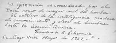 | La ignorancia es considerada por el Buda como el mayor mal del hombre. El cultivo de la inteligencia conduce al conocimiento y eleva al hombre hasta la esencia divina. Francisco de B. Echeverria. |  | ||