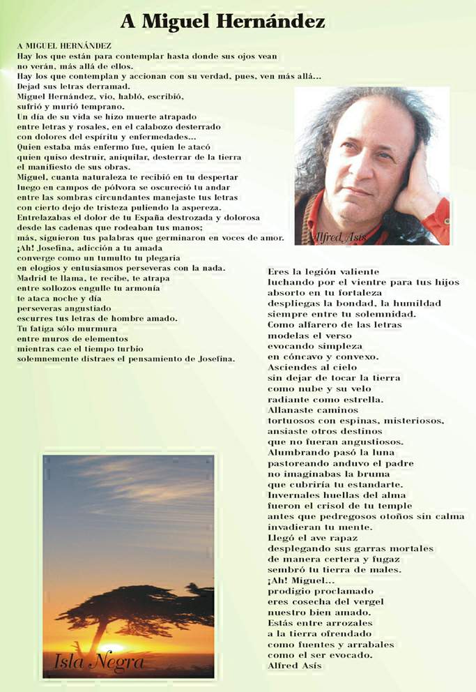 y primeros poemas En Orihuela, un pequeño pueblo del Levante español, rodeada del oasis exuberante de la huerta del Segura, nació Miguel Hernández el 30 de octubre de 1910. Hijo de un contratante de ganado, su niñez y adolescencia transcurren por la aireada y luminosa sierra oriolana tras un pequeño hato de cabras. En medio de la naturaleza contempla maravillado sus misterios: la luna y las estrellas, la lluvia, las propiedades de diversas hierbas, los ritos de la fecundación de los animales. Por las tardes ordeña las cabras y se dedica a repartir la leche por el vecindario. Sólo el breve paréntesis de unos años interrumpe esta vidad para asistir a la Escuela del Ave María, anexa al Colegio de Santo Domingo, donde estudia gramática, aritmética, geografía y religión, descollando por su extraordinario talento. En 1925, a los quince años de edad, tiene que abandonar el colegio para volver a conducir cabras por las cercanías de Orihuela. Pero sabe embellecer esta vida monótona con la lectura de numerosos libros de Gabriel y Galán, Miró, Zorrilla, Rubén Dario, que caen en sus manos y depositan en su espíritu ávido el germen de la poesía. A veces se pone escribir sencillos versos a la sombra de un árbol realizando sus primeros experimentos poéticos. Al atardecer merodea por el vecindario conociendo a Ramón y Gabriel Sijé y a los hermanos Fenoll, cuya panadería se convierte en tertulia del pequeño grupo de aficionados a las letras. Ramón Sijé, joven estudiante de derecho en la universidad de Murcia, le orienta en sus lectura, le guía hacia los clásicos y la poesía religiosa, le corrige y le alienta a proseguir su actividad creadora. El mundo de sus lecturas se amplía. El joven pastor va llevando a cabo un maravilloso esfuerzo de autoeducación con libros que consigue en la biblioteca del Círculo de Bellas Artes. Don Luis Almarcha, canónigo entonces de la catedral, le orienta en sus lecturas y le presta también libros. Poco a poco irá leyendo a los grandes autores del Siglo de Oro: Cervantes, Lope, Calderón, Góngora y Garcilaso, junto con algunos autores modernos como Juan Ramón y Antonio Machado. En el horno de Efén Fenoll, que está muy cerca de su casa, pasa largas horas en agradable tertulia discutiendo de poesía, recitando versos y recibiendo preciosas sugerencias del culto Ramón Sijé que acude allí a visitar a su novia Josefina Fenoll. Desde 1930 Miguel Hernández comienza a publicar poemas en el semanario El Pueblo de Orihuela y el diario El Día de Alicante. Su nombre comienza a sonar en revistas y diarios levantinos.